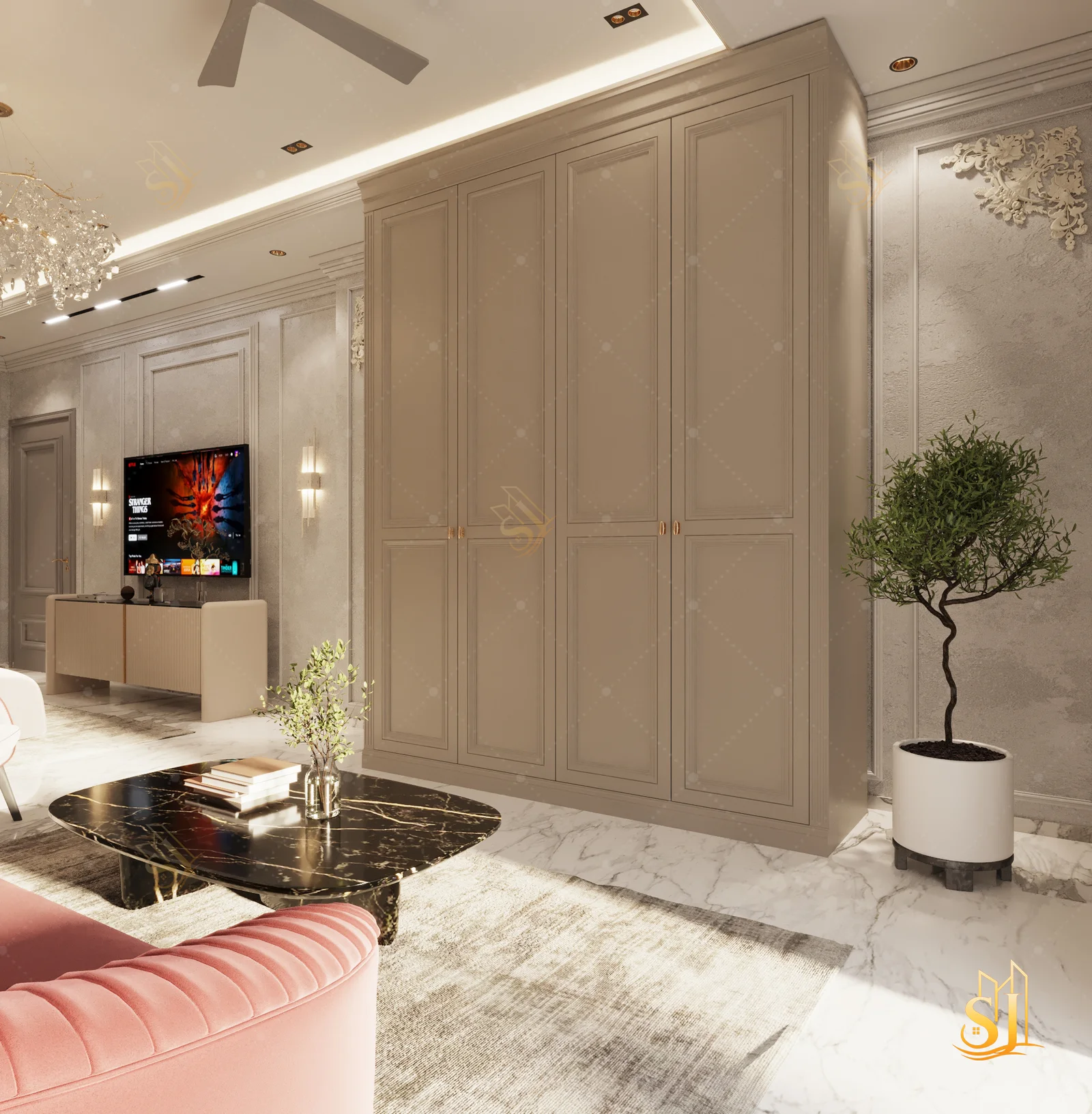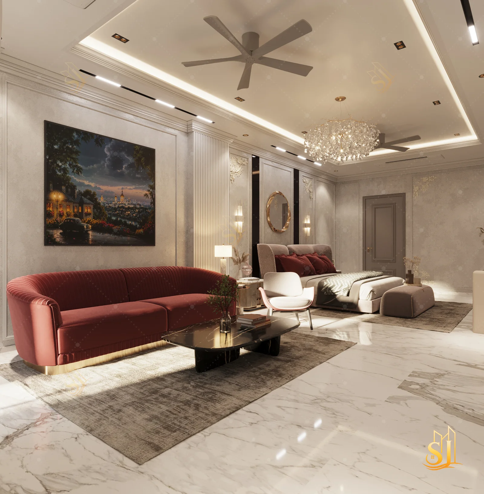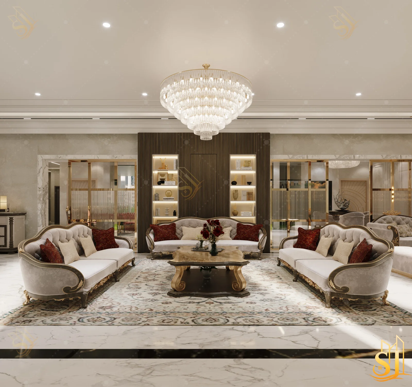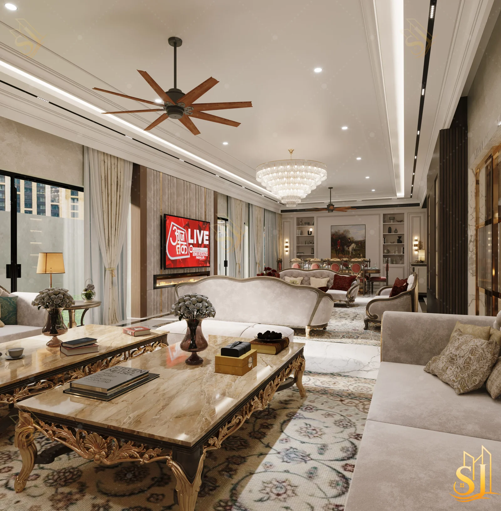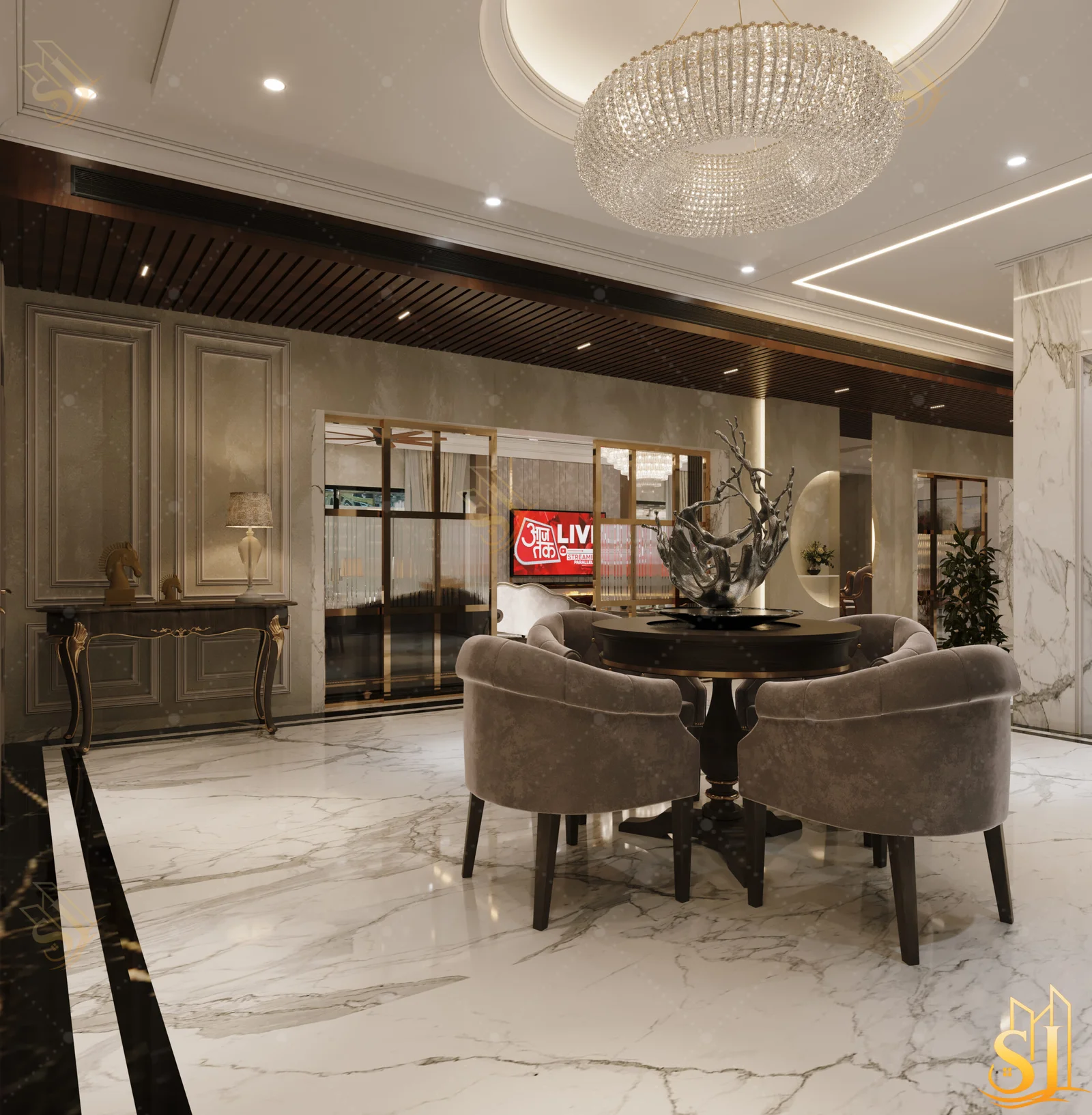 A luxurious and elegant residence designed to balance refined aesthetics with everyday comfort. Plush seating, intricate ceiling details, and a warm neutral palette come together to create a timeless living environment tailored for modern urban living.