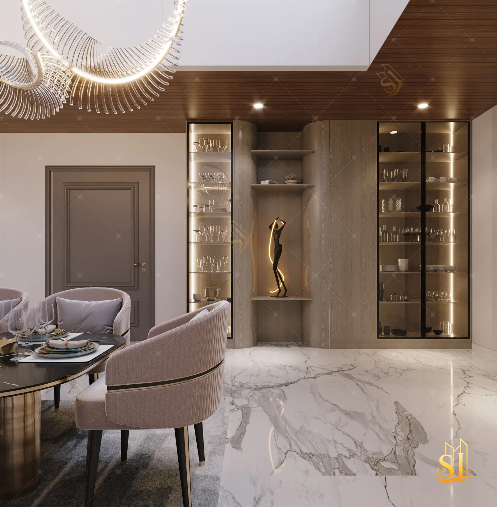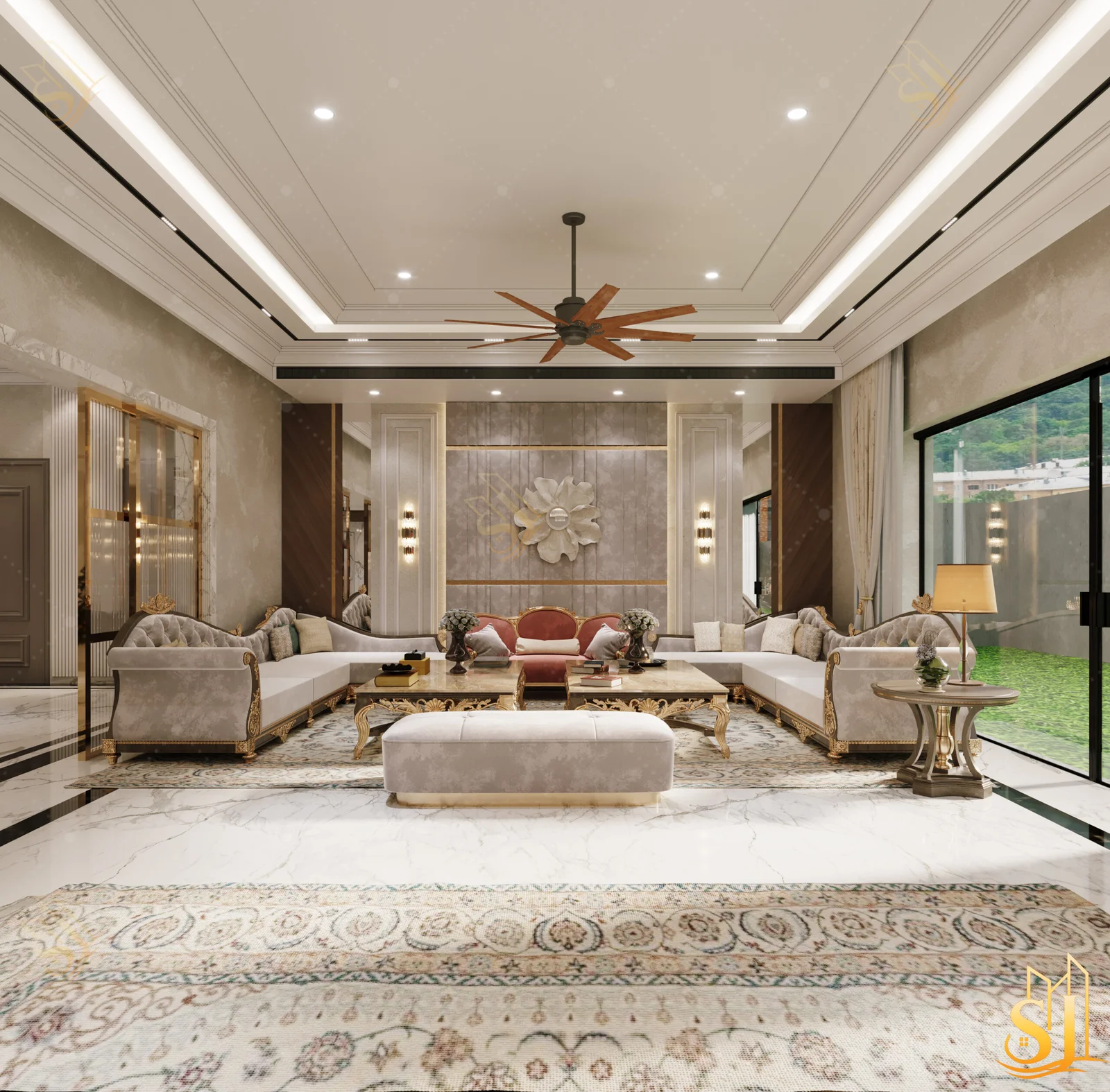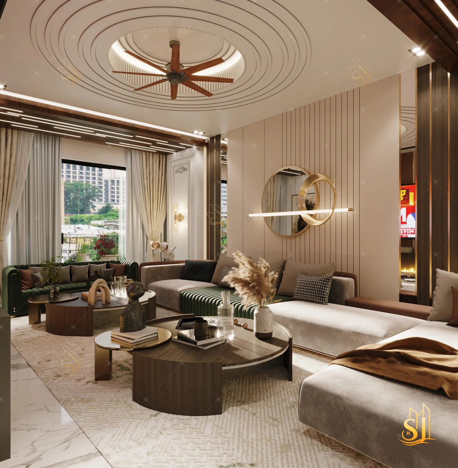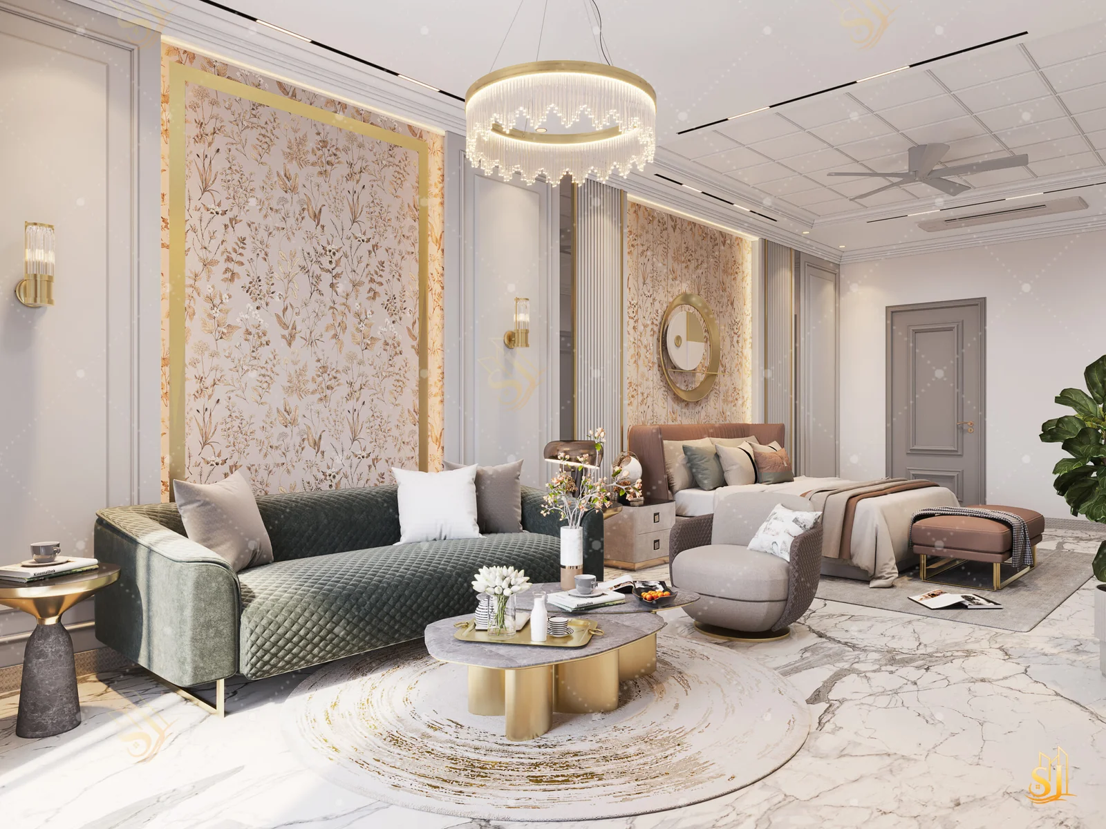 A luxurious and elegant residence designed to balance refined aesthetics with everyday comfort. Plush seating, intricate ceiling details, and a warm neutral palette come together to create a timeless living environment tailored for modern urban living.