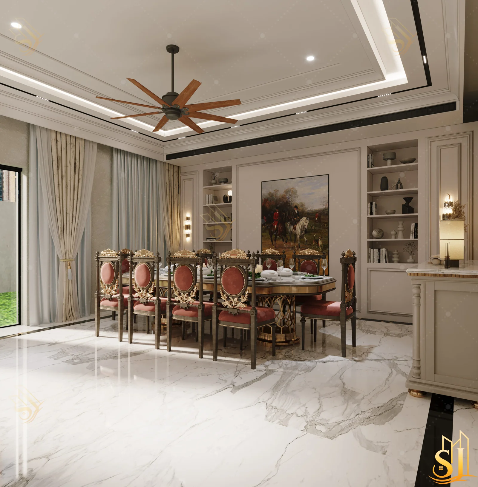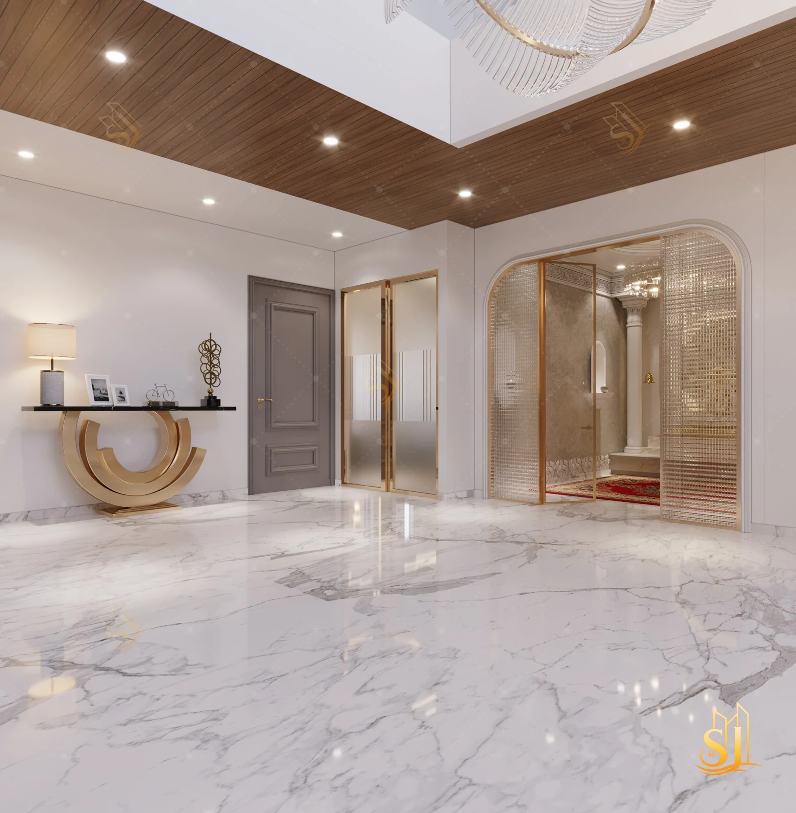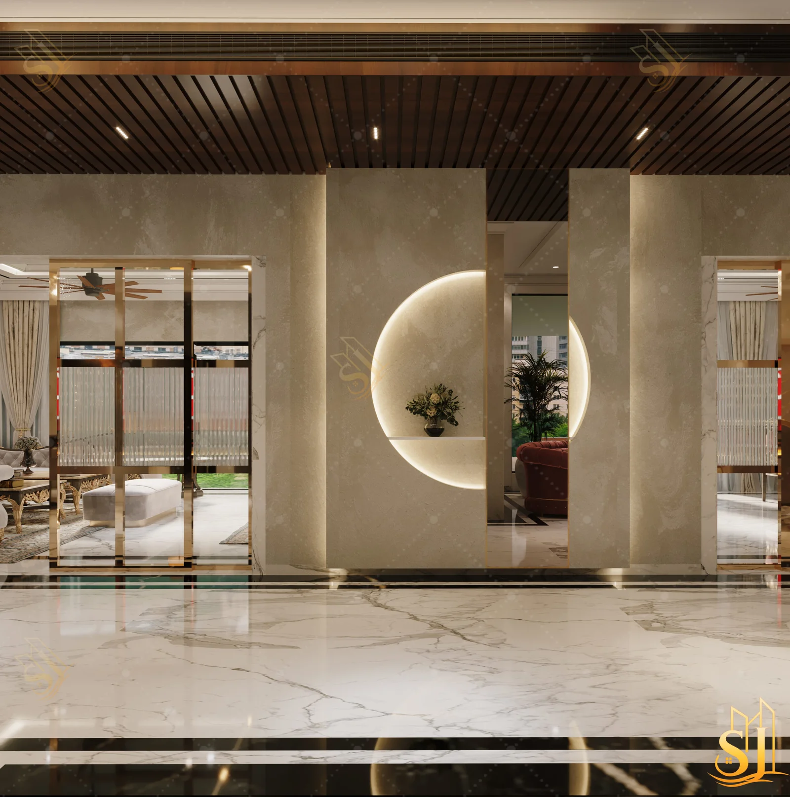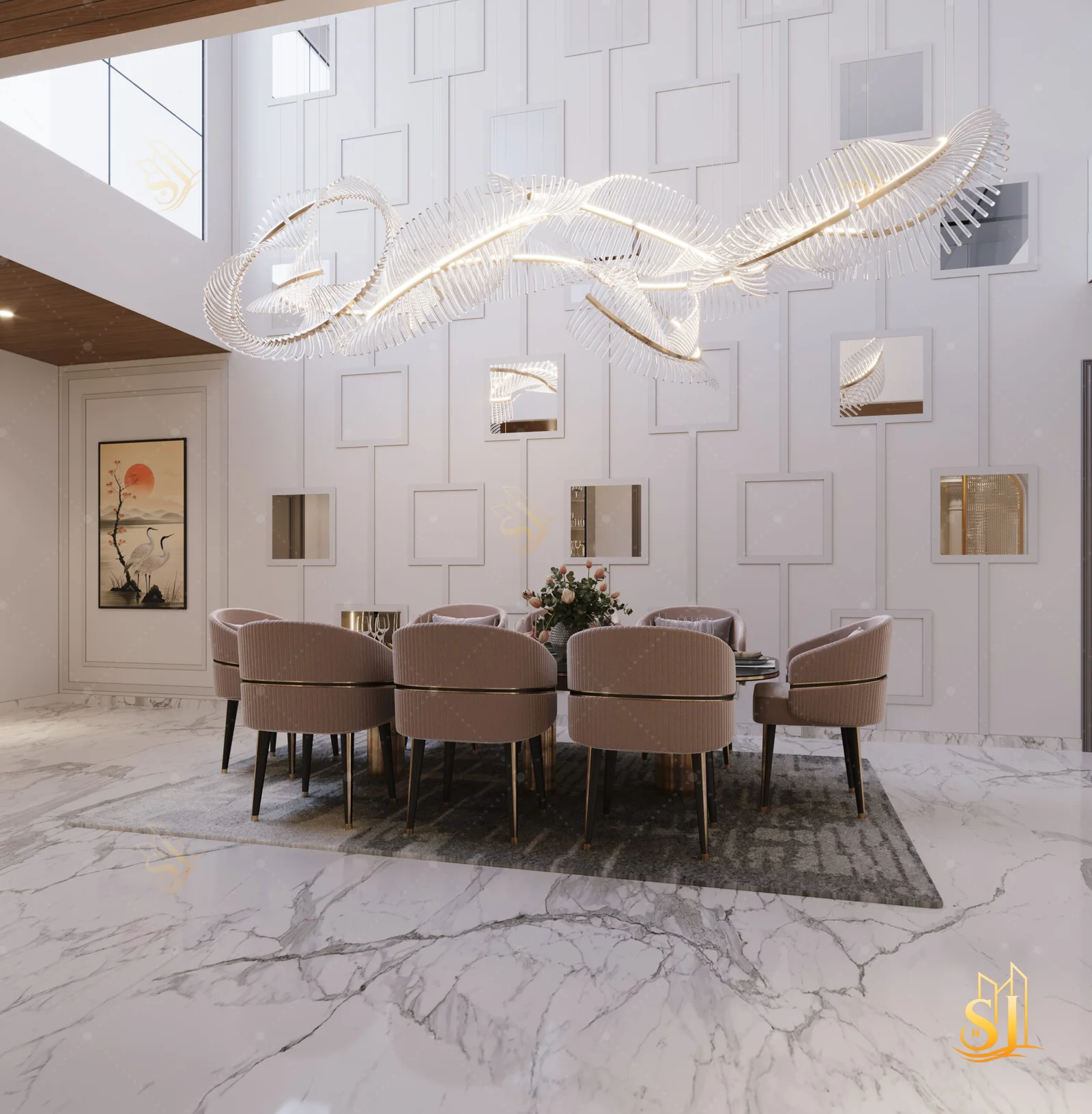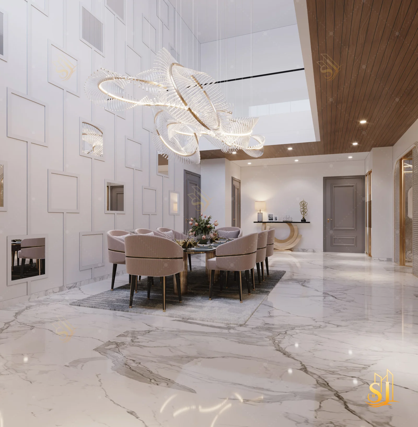A luxurious and elegant residence designed to balance refined aesthetics with everyday comfort. Plush seating, intricate ceiling details, and a warm neutral palette come together to create a timeless living environment tailored for modern urban living.