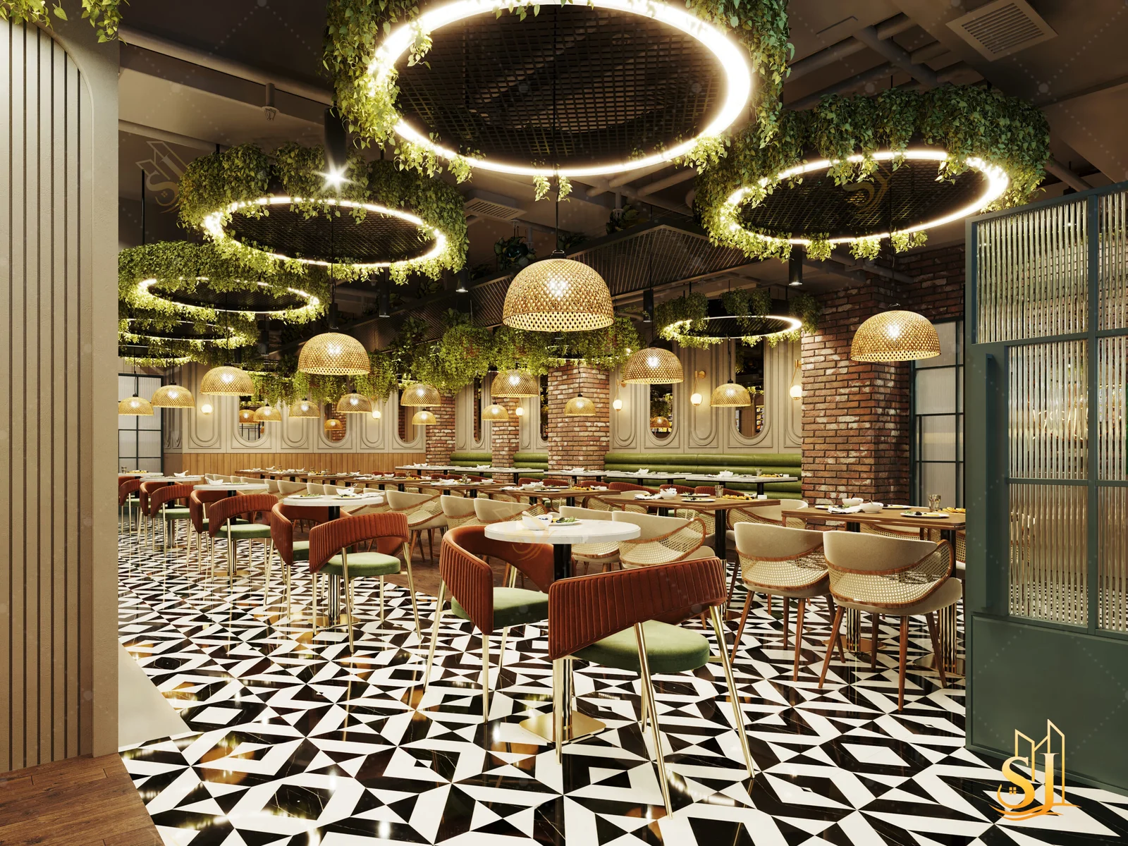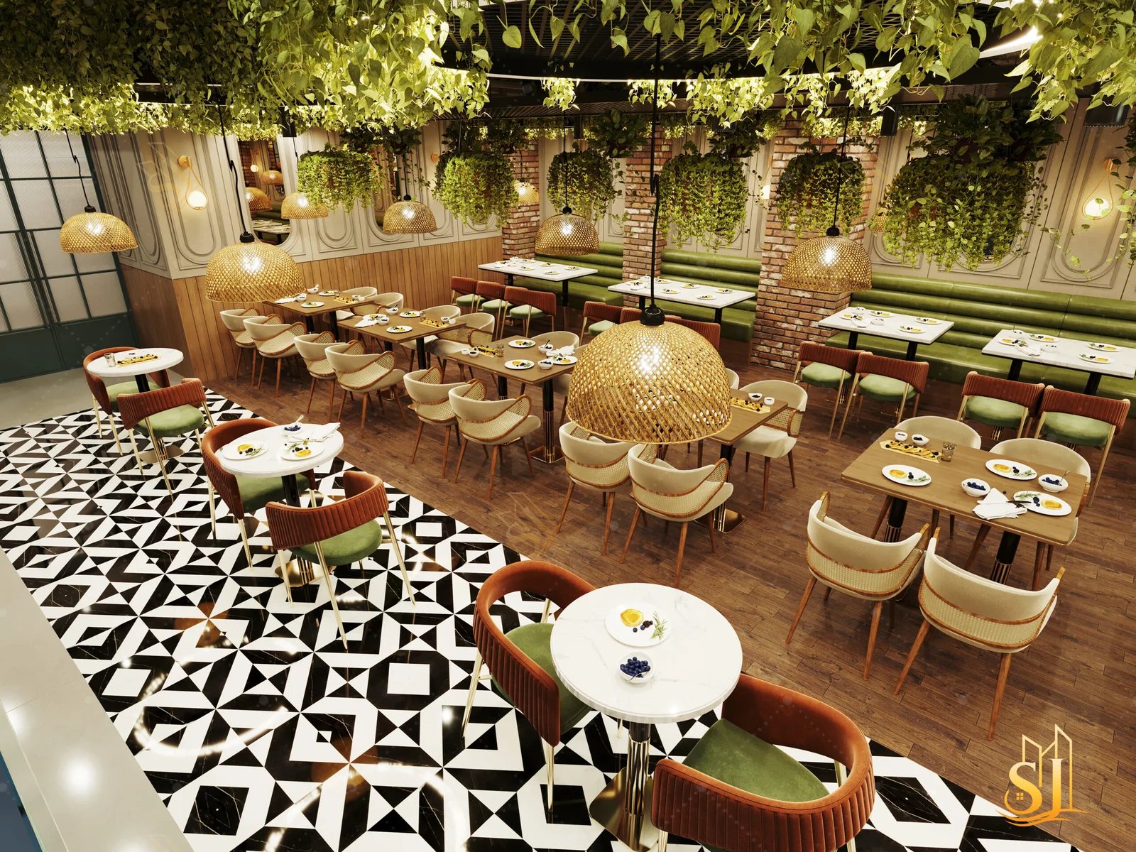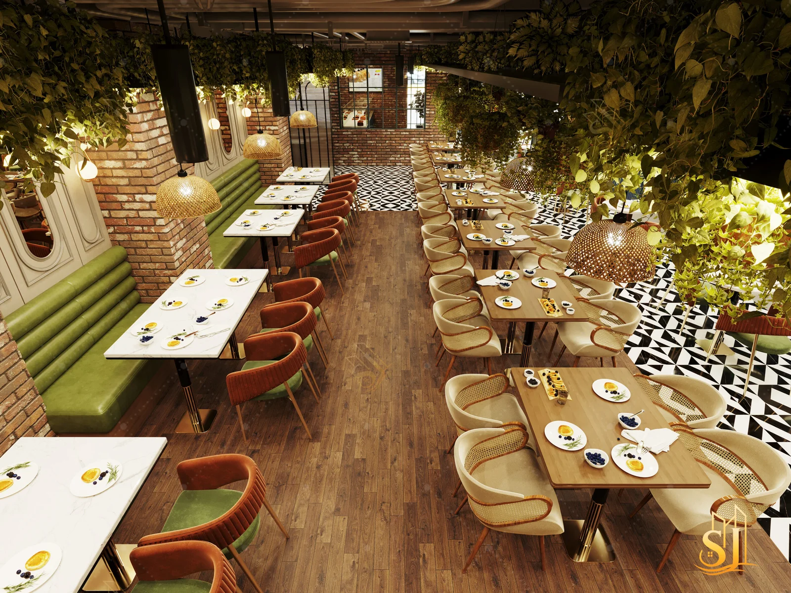 The interiors combine exposed brick textures, warm wood tones, and lush ceiling greens to evoke a vibrant yet grounded atmosphere. Carefully planned lighting enhances the mood across different zones, while seating layouts ensure both intimacy and flexibility for varied group sizes. Every design element contributes to an experience that is festive, elegant, and memorable.