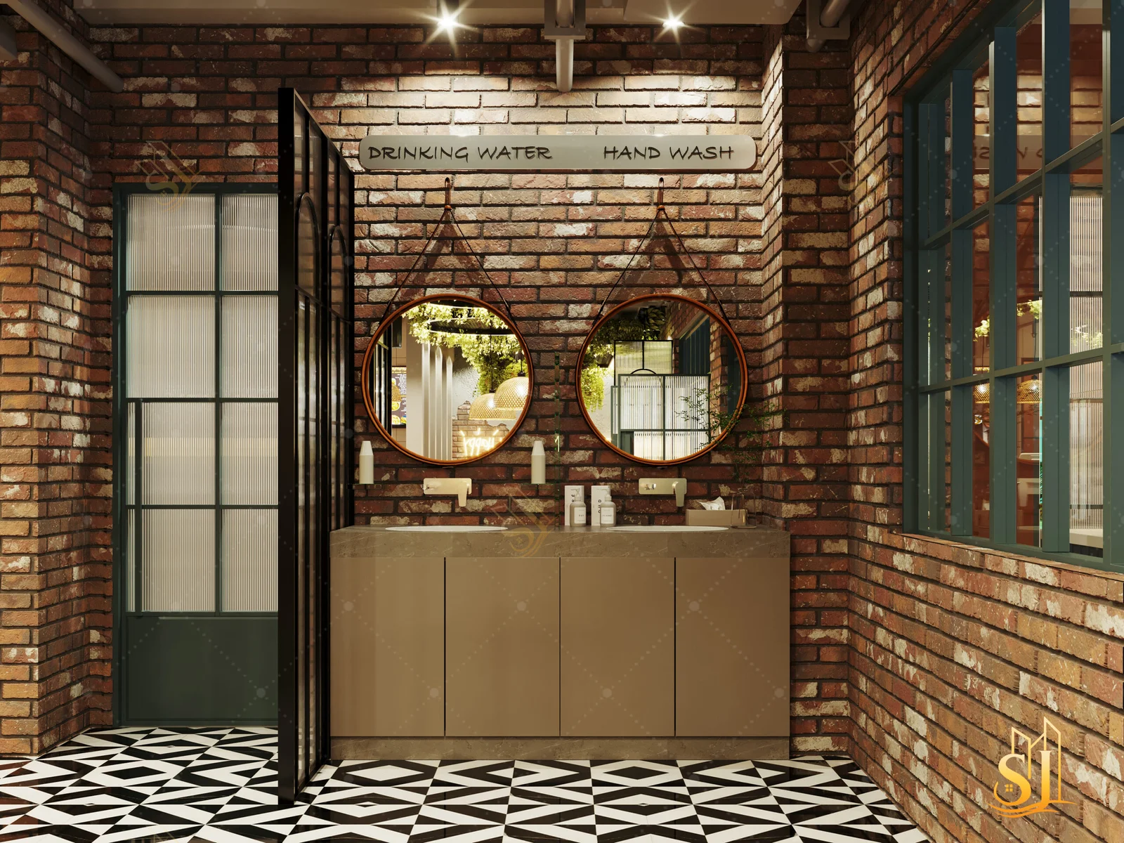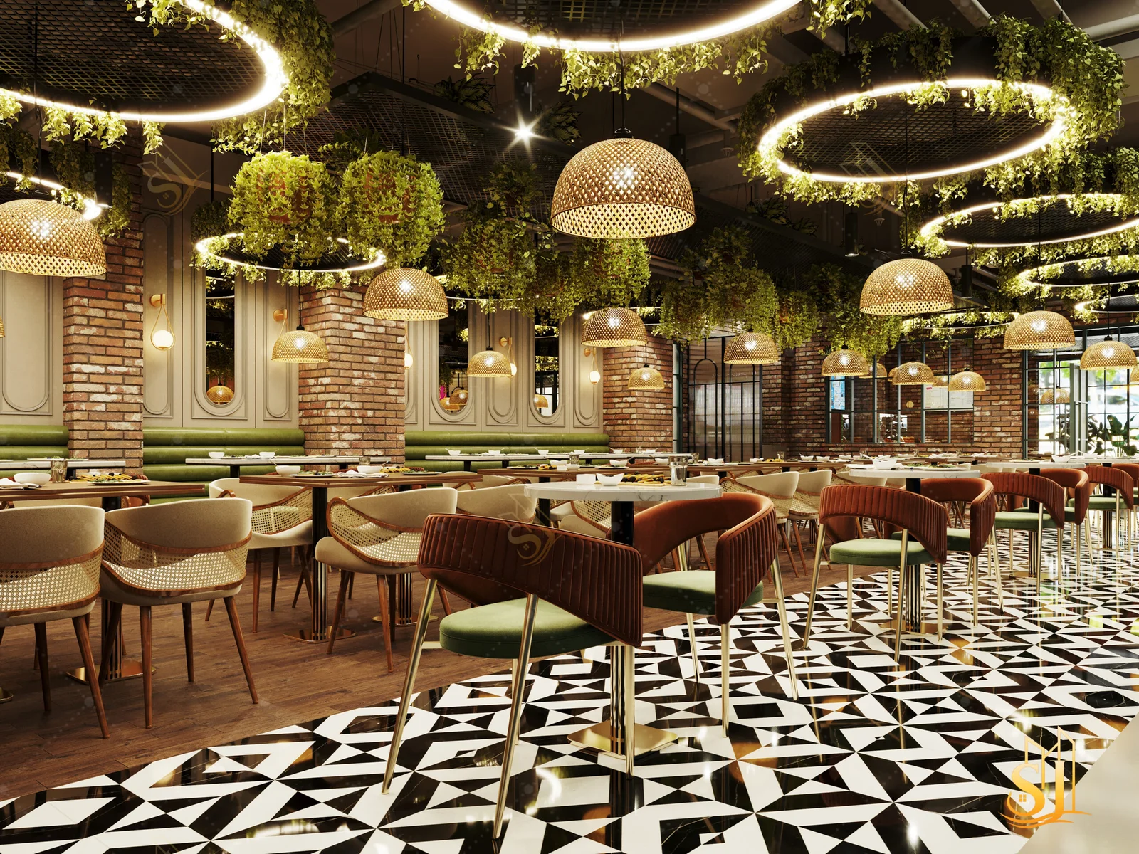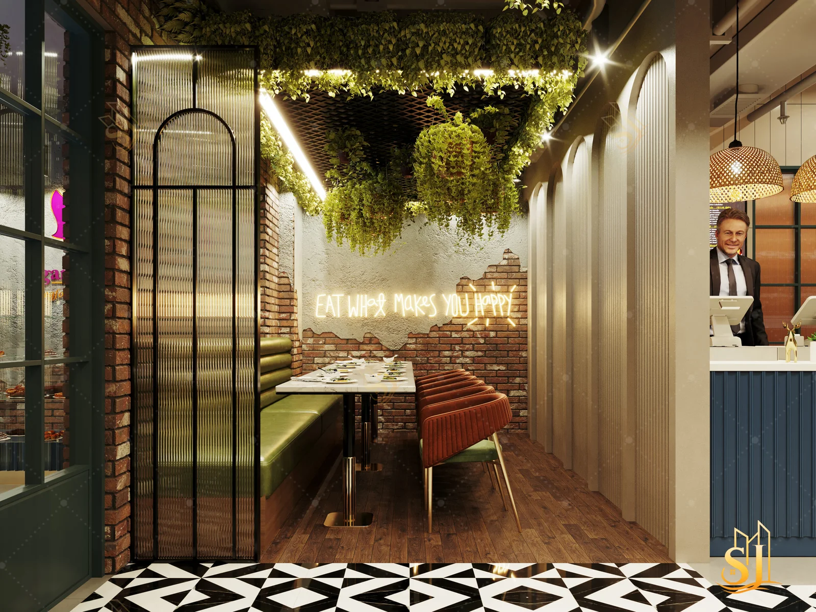 The interiors combine exposed brick textures, warm wood tones, and lush ceiling greens to evoke a vibrant yet grounded atmosphere. Carefully planned lighting enhances the mood across different zones, while seating layouts ensure both intimacy and flexibility for varied group sizes. Every design element contributes to an experience that is festive, elegant, and memorable.
