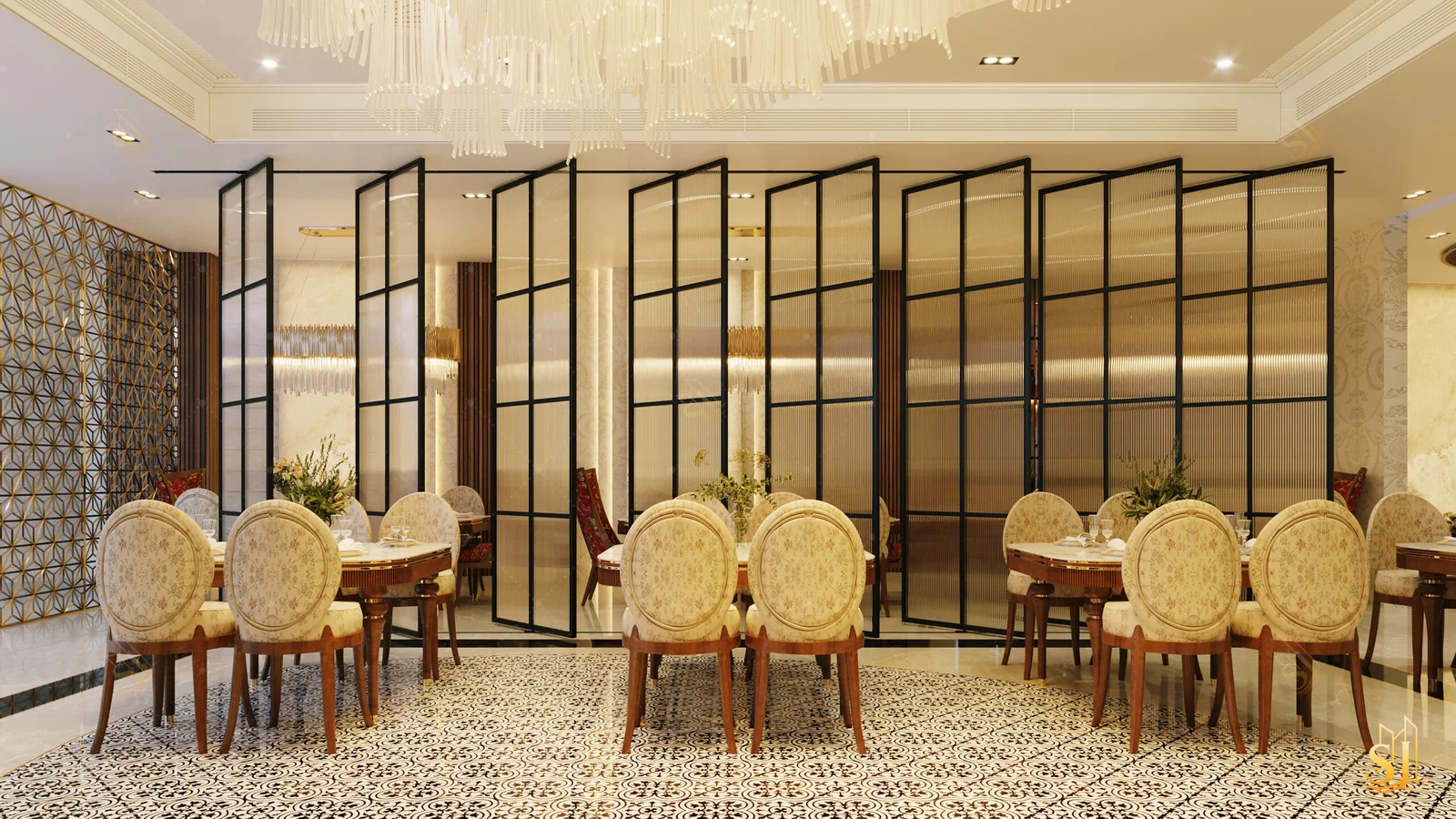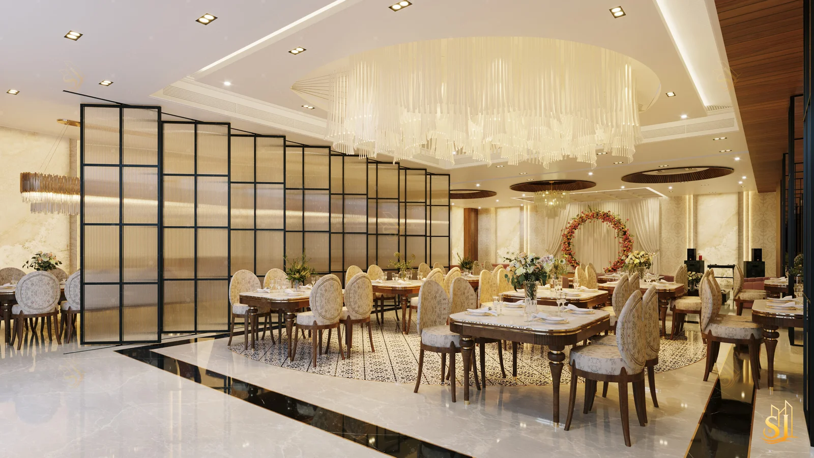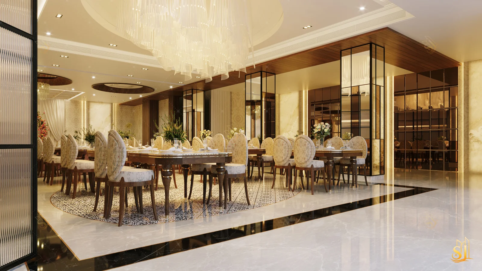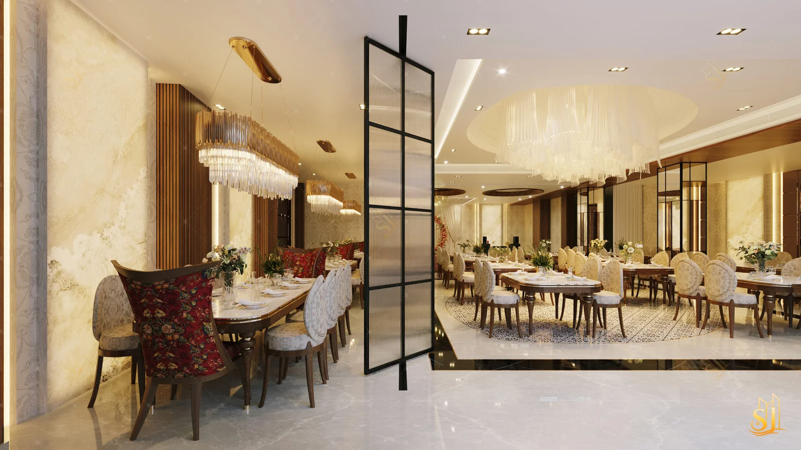 Ganeshwaram is a luxurious hospitality space that blends classic Indian warmth with contemporary elegance. Designed to host fine dining and grand celebrations, the interiors create an immersive experience through rich textures, warm lighting, and thoughtfully curated spatial planning.
